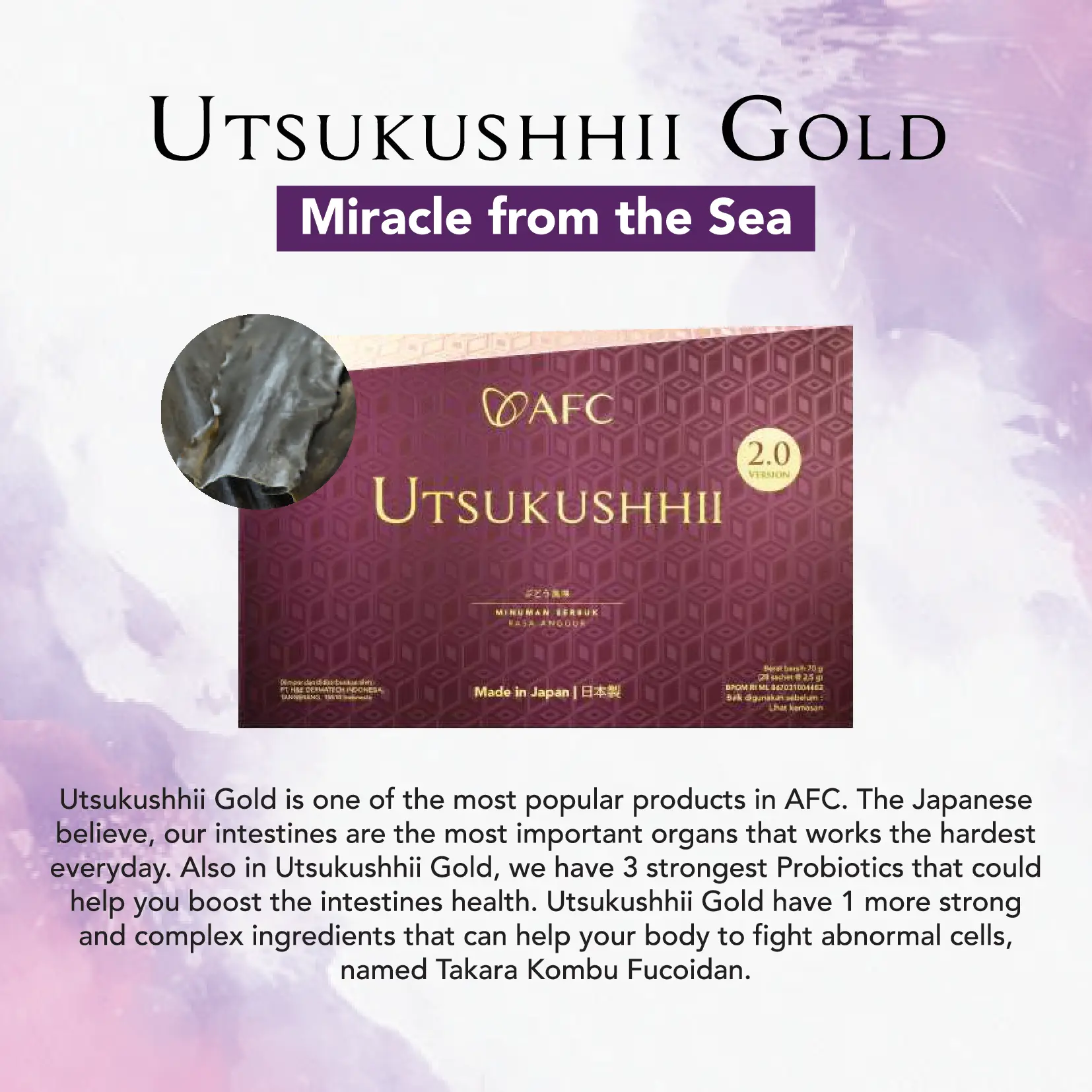 Utsukushii Gold adalah salah satu produk terpopuler di AFC yang diformulasikan untuk mendukung kesehatan pencernaan. Di Jepang, dipercaya bahwa usus adalah organ yang paling penting dan bekerja keras setiap hari. Untuk itu, Utsukushii Gold dilengkapi dengan tiga jenis probiotik terkuat yang dapat membantu meningkatkan kesehatan usus Anda. Selain itu, produk ini juga mengandung satu bahan kuat dan kompleks yang dikenal dengan nama Takara Kombu Fucoidan, yang dapat membantu tubuh Anda dalam melawan sel abnormal.